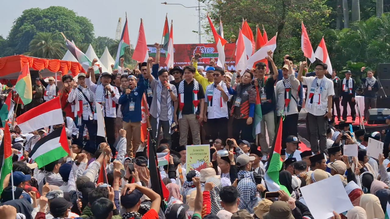 JAKARTA – Ribuan warga mengikuti aksi bela Palestina bertajuk “Indonesia Melawan Genosida” yang digelar di kawasan Patung Kuda, Jakarta Pusat pada Minggu.